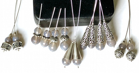 Elodie m’a apporté son sautoir d’agates grises pour que je prélève deux perles afin de réaliser une paire de boucles d’oreilles assorties à son collier.