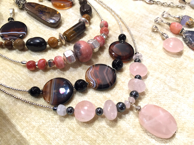 Bijoux réalisés avec du Quartz rose, Onyx, Opale rose, Bois pétrifié (fossile) et on aperçoit un petit pendentif en Calcédoine avec sa roche mère
